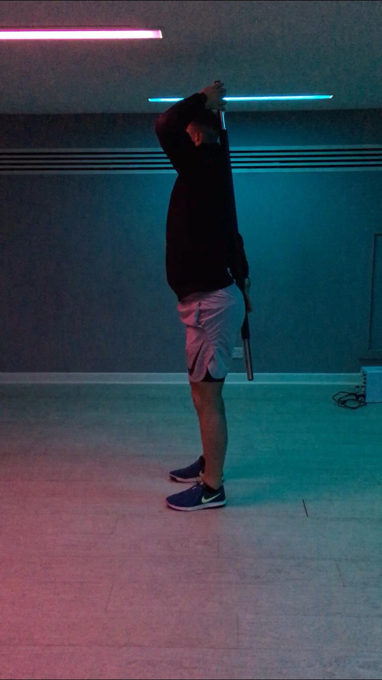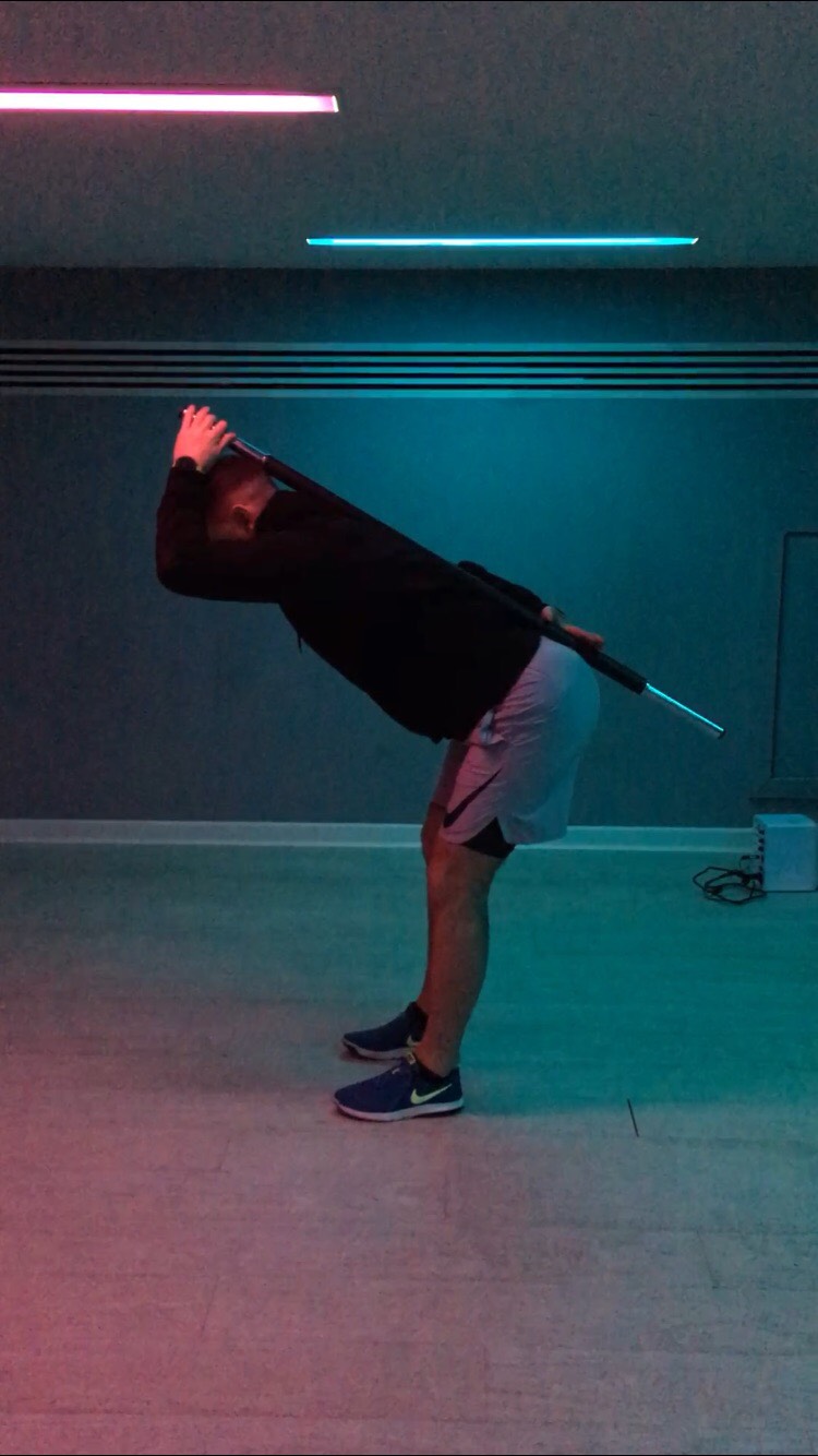Here, I have a small barbell from our studio but you can use a broomstick to do this or a golf club or rigid length of tubing.